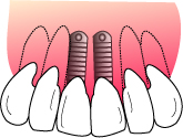 無くなった歯の代わりに、人工歯根(インプラント)をあごの骨に植えこんで歯を再現します。人工の材料(金属)を、あごの骨に強固に結合させることによって歯の根の働きを回復します。